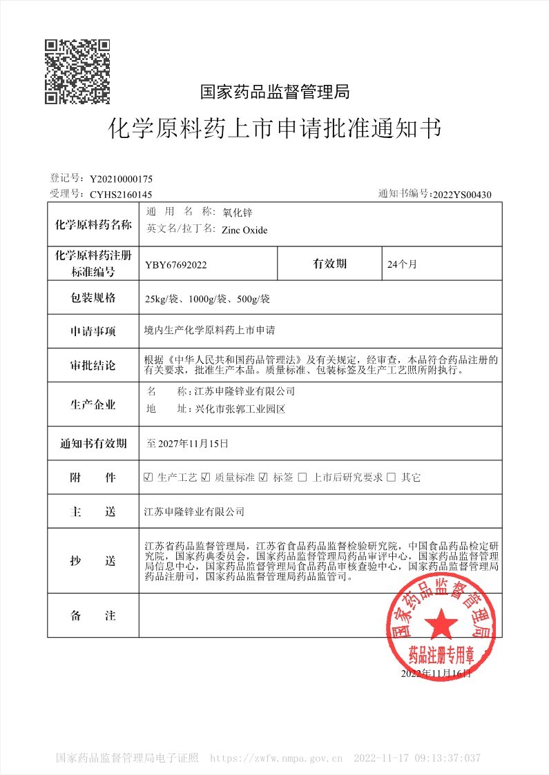 Notice of Approval for Marketing Application of Chemical Raw Materials